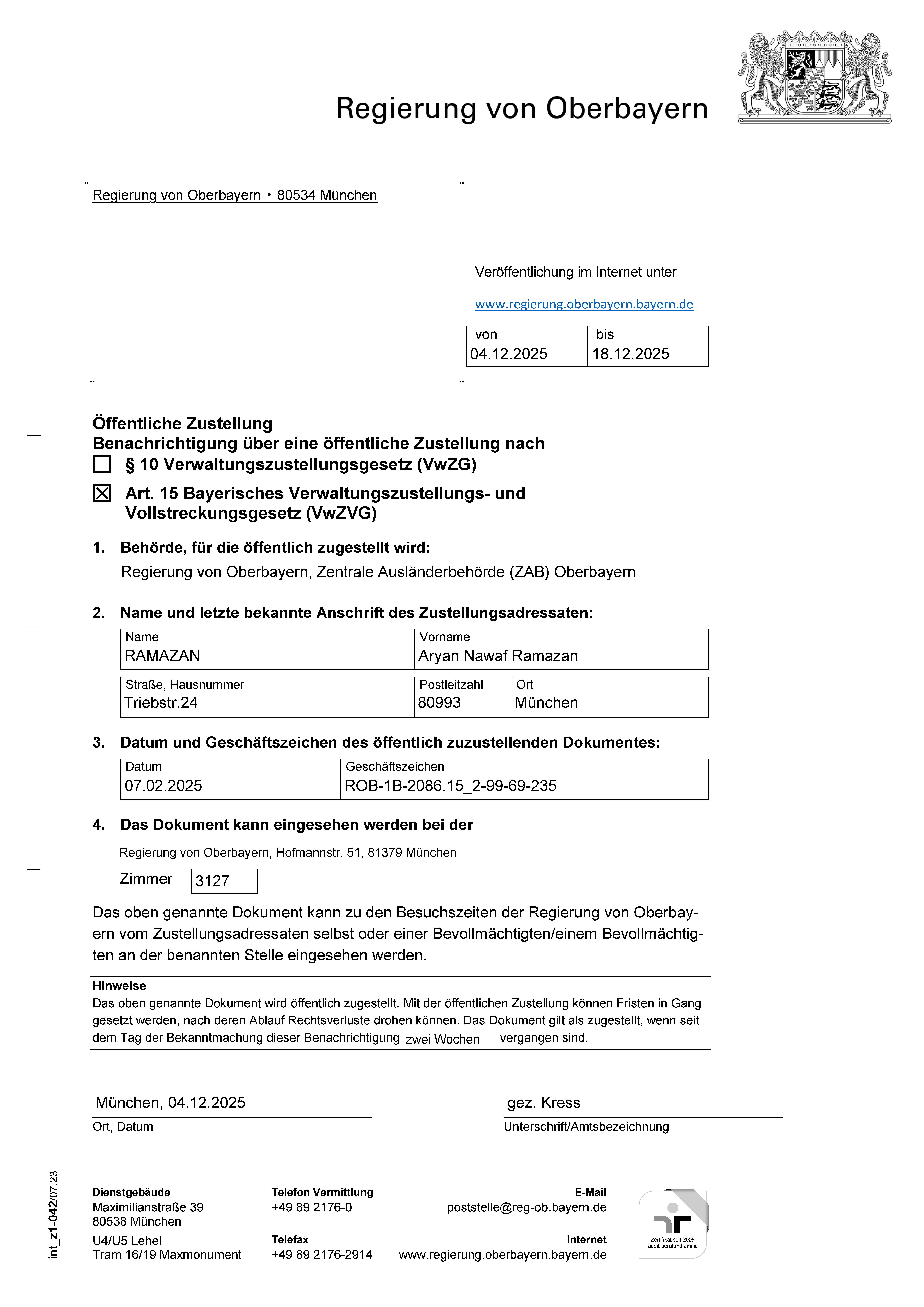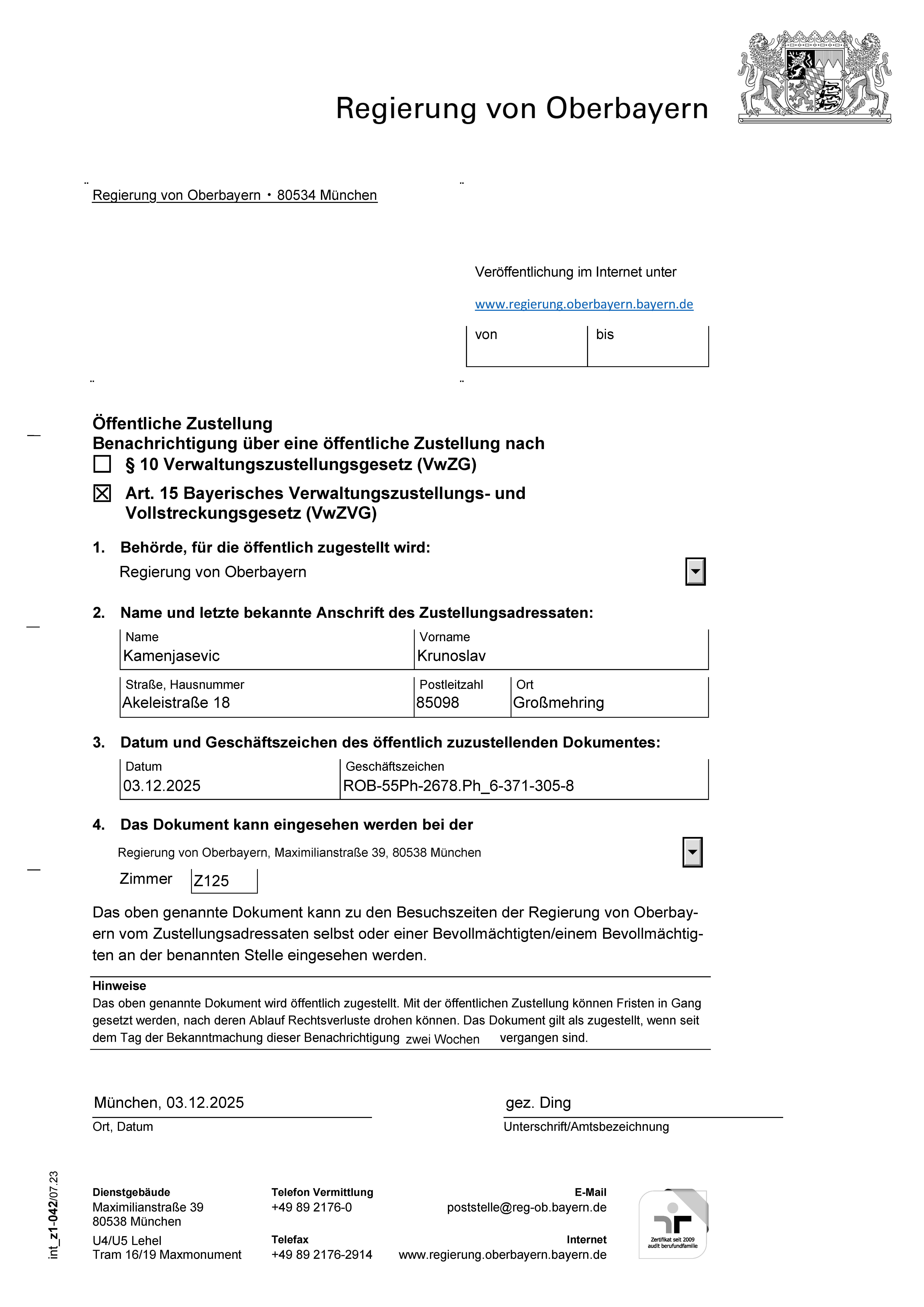 Öffentliche Zustellungen der Regierung von Oberbayern nach § 10 Verwaltungszustellungsgesetz (VwZG) sowie nach Art.15 Bayerisches Verwaltungszustellungs- und Vollstreckungsgesetz (VwZVG) erfolgen durch Bekanntmachung auf dieser Seite.